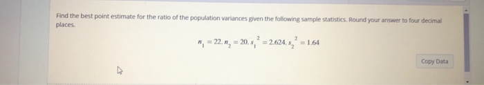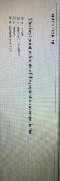 What is the best point estimate for the population mean A ... from www.coursehero.com The single statistic value is termed as best estimate or best guess. Jeffrey point estimate = 0.45313. What is the difference between confidence interval and point estimate? Finally, enter the value for the confidence interval which is a percentage value. How to calculate point estimate in statistics? Jeffrey = s + 0.5 t + 1 = 4 + 0.5 9 + 1, = 4.5 10, = 0.45. If 0.5 < x/n < 0.9, the mle method is applied; A confidence interval is usually expressed by two values enclosed by parentheses, as in (192, 204).